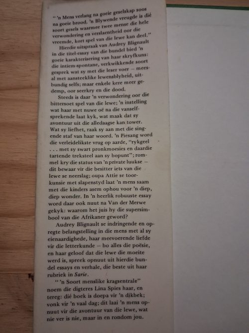 Sagteband boek met klein skeurtjie op voorblad and naam in swart ink binne in voorblad. Bladsye skoon en netjies, rugstuk stewig. Verwagte verwering sigbaar op buite blad hoekies. Goeie toestand.
